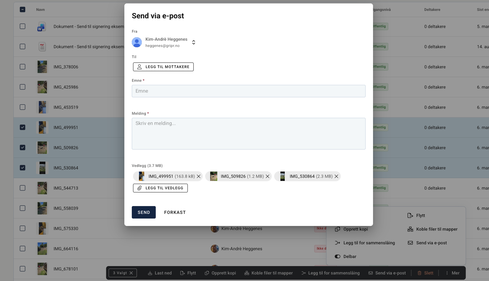 Gipr har fått flere oppdateringer siste ukene hvor man blandt annet nå kan sende Dokumenter og bilder som vedlegg på epost rett fra Gripr - fungerer i dokumentsenter og alle steder hvor vedlegg er tilgjengelig. Skjema og tilbud kan også sendes som PDF til epost før man evt. ber om en signering.